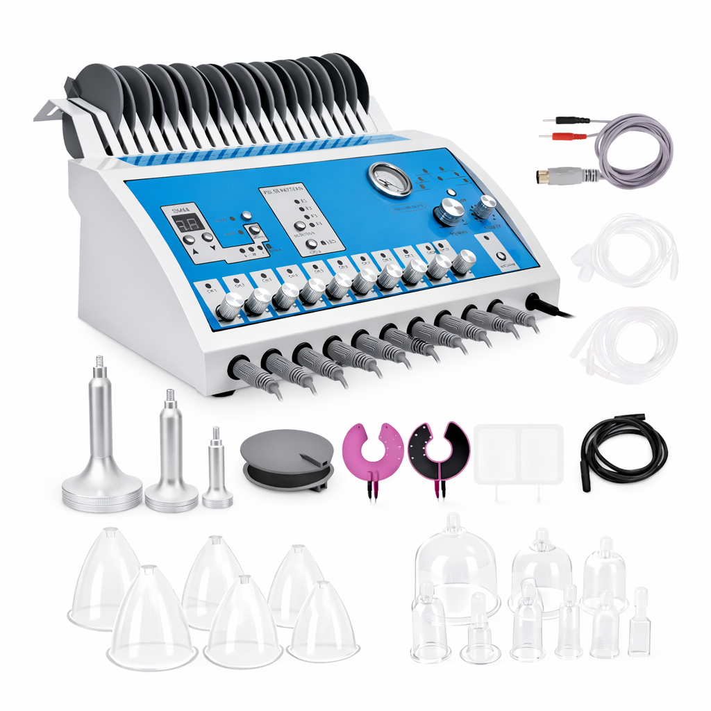 Accesorios: Incluye diversas copas para succión en áreas como glúteos y senos, así como parches para electroestimulación.